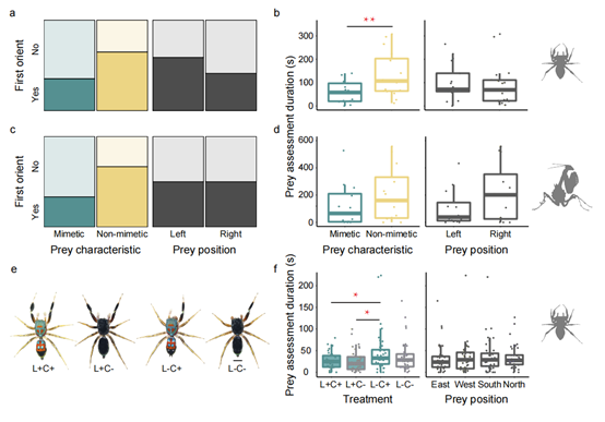 该研究结合性状量化与行为学实验来研究跳蛛的不完美蚂蚁拟态。该研究首先进行了轨迹分析(图2)及步态分析(图3),证明了科氏翠蛛与多个假定的蚂蚁模型物种高度相似,支持了不完美拟态理论中的多模型假说。通过背景匹配分析揭示了科氏翠蛛体色可能通过背景伪装起到了保护色的作用(图4)。进一步的捕食实验发现科氏翠蛛的被捕食风险显著低于同域分布的非拟态跳蛛(图5),证实了其不完美拟态是一种有效的贝氏拟态。该研究结果定量地证明了科氏翠蛛存在拟态与伪装结合的策略,强调了一种由自然选择驱动的复杂现象的重要性。