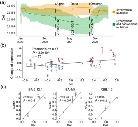 图1. 新冠病毒密码子使用的变化趋势以及密码子使用对蛋白表达的潜在影响 (Wu et al., 2023, Adv. Sci.)