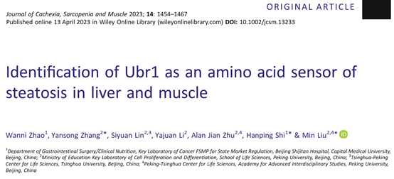 2023年6月2日,PA视讯游戏平台官网朱健/刘敏课题组在Journal of Cachexia, Sarcopenia and Muscle杂志发表了题为Identification of Ubr1 as an amino acid sensor of steatosis in liver and muscle的研究论文,发现E3泛素连接酶Ubr1是肝脏和肌肉中重要的营养感应器。当必需氨基酸匮乏时,Ubr1在肝细胞和肌肉细胞中失活,不能催化脂解抑制蛋白Plin2的多聚泛素化降解。Plin2蛋白水平的升高则会抑制肝脏与肌肉脂肪的分解,从而导致脂肪变性。