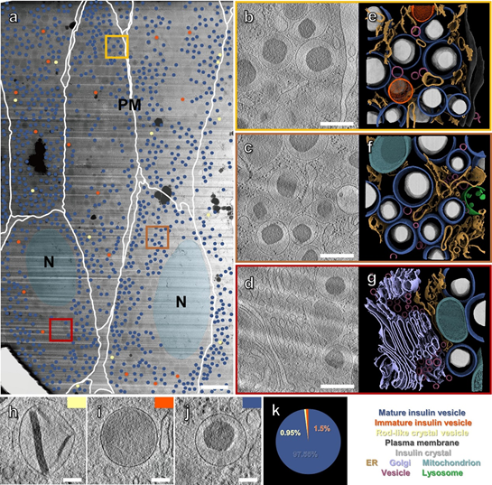 采用此方法,研究者对小鼠胰岛进行冷冻电镜原位结构观察,首次实现了β细胞胰岛素晶体的原位分析(图2)。研究者观察到三种不同类型的囊泡,分别为棒状晶体囊泡(图 2h),未成熟胰岛素晶体囊泡(图 2i)以及成熟的胰岛素晶体囊泡(图2j),并对囊泡的数量与位置分布进行了统计(图2a,2k)。分析结果表明成熟的胰岛素晶体囊泡占97%,且不同类型的胰岛素囊泡分布无明显特征。而此前使用单细胞体系研究发现不同成熟状态的胰岛素囊泡呈现有组织的空间分布,说明了组织等多细胞原位结构研究的必要性。