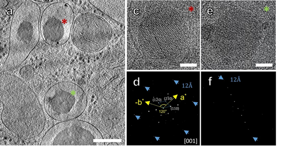 通过对此流程所收集的数据进行了分析(图3),研究者原位确定了胰岛素的晶胞参数(图 3c-f)。其与体外观察到的六方晶体的结构差异则表明细胞内生理条件对晶体堆积的潜在影响。
