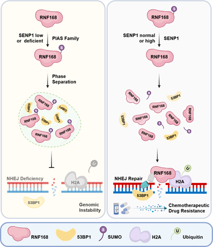 该研究发现RNF168的SUMO化修饰促进其在细胞核内液-液相分离(LLPS)的形成,阻碍RNF168被招募到DNA损伤位点,进而下调RNF168对组蛋白H2A的泛素化修饰。同时,该LLPS液滴包裹下游关键修复蛋白53BP1,抑制其被招募到损伤修复位点并最终导致NHEJ修复效率的下降。进一步研究表明,SENP1是RNF168的特异性去SUMO化酶。当DNA双链断裂损伤发生时,结肠癌细胞中高表达的SENP1去除RNF168的SUMO化修饰,阻止RNF168液-液相分离形成,从而维持基因组的稳定性,使肿瘤细胞对化疗药物产生抵抗,最终导致肿瘤进一步恶化,肿瘤组织中SENP1的高水平表达与癌症患者预后不良相关。