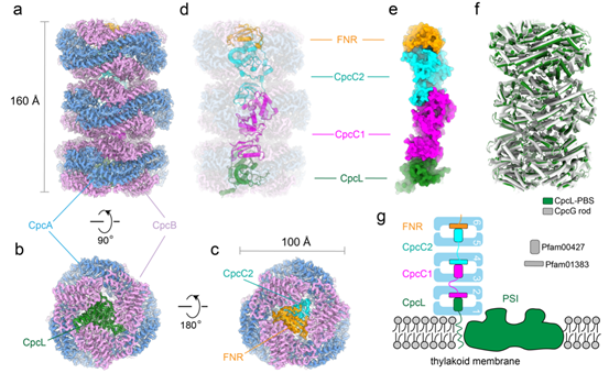 蓝细菌是最早将太阳能转化为化学能的生物种群之一,是24亿年前地球上氧气含量上升的原因。蓝细菌对光能的捕获主要通过藻胆体完成,并将捕获的光能传递给光系统II(Photosystem II, PSII)或者光系统I(Photosystem I, PSI)。蓝细菌中的藻胆体存在两种类型,CpcG-PBS和CpcL-PBS。CpcG-PBS由核心(Core)和外周杆(Rods)组成,外周杆通过连接蛋白CpcG附着在核心周围。相比之下,CpcL-PBS具有更小的尺寸,只包含一个外周杆,并不存在核心部分。CpcL-PBS通过连接蛋白CpcL与光合膜连接,与PSI相互作用并可以将吸收的能量传递给PSI。CpcL-PBS还参与NAD(P)H脱氢酶-CpcL-PBS-PSI(NDH-PBS-PSI)超复合物的形成,并对于环式电子传递(Cyclic electron transfer,CEF)不可缺少1,同时CEF也需要铁氧还蛋白-NADP+氧化还原酶(Ferredoxin-NADP+ oxidoreductase, FNR)和CpcL-PBS的相互作用2。FNR可以附着在CpcG-PBS或者CpcL-PBS的外周杆上,但是已经报道的CpcG-PBS的结构中并没有发现FNR的存在。尽管对于CpcG-PBS的能量传递机制研究者在2021年已有报导3,但是对于CpcL-PBS向PSI的能量传递机制以及CpcL-PBS在NDH-PBS-PSI超复合物形成中的作用研究尚不清楚。