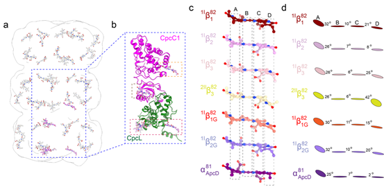尽管CpcL-PBS和CpcG-PBS的外周杆高度相似,但是CpcL-PBS在室温荧光上有一个668纳米的发射峰,这相比于CpcG-PBS外周杆的发射峰有一个相当明显的红移。之前对于远红外光适应物种的研究发现光的红移可能和bilin的构象有关4。为了探明CpcL-PBS复合物红移的原因以及CpcL-PBS是如何将能量传递给PSI的,研究者分析了CpcL-PBS复合物中bilin的构象。结构分析发现,CpcL-PBS复合物中的bilin的构象不尽相同,这种差异化的bilin主要集中分布在连接蛋白的周围(图2a,b)。在CpcG-PBS复合物的研究中,研究者已经报导了连接蛋白在能量传递中的作用3,通过CpcG和CpcL-PBS中对应位置bilin构象的比较,研究者发现bilin的差异化主要表现在bilin的Ring C和Ring D的变化上(图2c,d)。而Ring C和Ring D是bilin和连接蛋白相互作用的区域,在CpcL-PBS和CpcG-PBS的外周杆中,这种bilin的差异性来源于bilin的Ring C和Ring D和连接蛋白CpcL或者CpcG相互作用的结果,表明连接蛋白可以调节bilin的能量状态,从而使得bilin的能级和光谱存在不同。