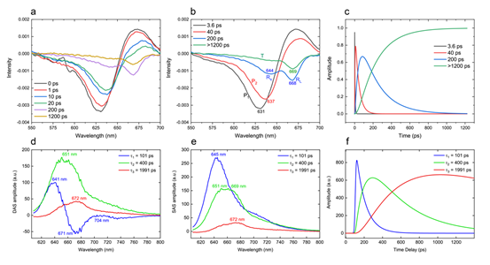 为了进一步探究CpcL-PBS能量传递的动态特性,研究者采用超快光谱的方法去研究CpcL-PBS中激子的迁移(exciton migration)。之前对于蓝细菌Synechocystis 68035和Anabaena 7120 6的CpcL-PBS到PSI能量传递的研究发现,CpcL-PBS中存在“red bilin”并且对于CpcL-PBS的能量传递非常重要。本研究采用飞秒时间分辨的瞬态吸收光谱(Femtosecond time-resolved transient absorption spectroscopy)研究完整的CpcL-PBS的光谱学性质(图3a-c),结果显示组分P1有3.6 ps的衰减时间(decay time),并且在631 nm处存在吸收漂白,在671 nm处存在一个正吸收峰。组分P2有40 ps的衰减时间,在637 nm处存在吸收漂白,在675 nm处存在一个正吸收峰。组分Rs和RL有一个中等的衰减时间为200 ps,它们的吸收漂白分别在644 nm和668 nm处。最慢的组分T衰减时间大于1200 ps,并且在669 nm处存在吸收漂白(图3c)。这些结果表明,CpcL-PBS的能量迁移发生在皮秒时间范围内,并按照如下方式传递: