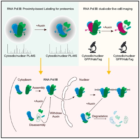 图文摘要. 通过瞬时降解联合活细胞标记的方法,揭示了亚细胞定位在决定RNA聚合酶III命运中的作用。