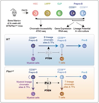 为了探究PTEN调控造血谱系选择的机制,研究人员通过流式细胞术对野生型和Pten缺失小鼠体内的多种造血祖细胞及前体细胞做了定量分析,发现Pten缺失引起B系祖细胞prepro-B的增多。sc-RNA-seq及ATAC-seq分析以及体外培养实验表明Pten缺失会显著改变prepro-B细胞中关键谱系转录因子结合位点的染色质开放性,影响其下游靶基因的表达,最终导致B系分化潜能降低,而髓系和T系潜能增强。进一步,他们发现PU.1作为PTEN的下游关键转录因子调节谱系转录因子结合位点的开放性,而改变PU.1的水平可以重编程Pten缺失的prepro-B细胞的分化潜能。
