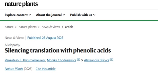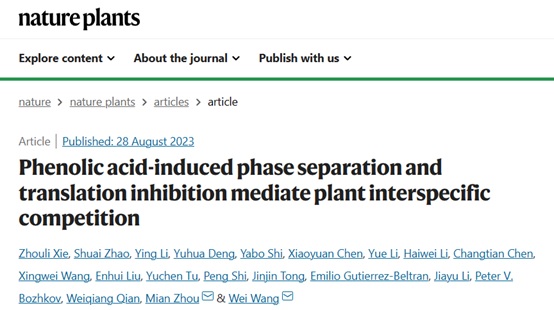 2023年8月28日,PA视讯游戏平台官网、蛋白质与植物基因研究国家重点实验室、生命科学联合中心王伟课题组,在《Nature Plants》以两倍长文篇幅发表题为“Phenolic acid-induced phase separation and translation inhibition mediate plant interspecific competition”的研究论文,报道了酚酸通过应激颗粒和蛋白相变来抑制翻译从而调控种间竞争的新机制。《Nature Plants》同期也刊登了对本研究的评述文章。