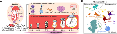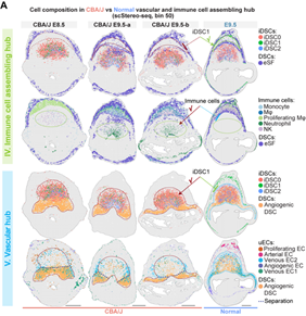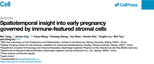 2023年9月11日,PA视讯游戏平台官网杜鹏课题组在Cell杂志在线发表了题为“Spatiotemporal insight into early pregnancy governed by immune-featured stromal cells”的研究论文。在这项研究中,作者结合使用单细胞转录组和华大单细胞空间转录组技术 ADDIN EN.CITE ADDIN EN.CITE.DATA [8]首次对小鼠妊娠早期(E5.5-E9.5)着床位点的细胞组成进行了详细定义,并根据不同细胞的空间动态分布,鉴定出妊娠早期着床位点的8个不同功能中心,最终通过比较健康小鼠和复发性流产模型小鼠着床位点功能中心的差异,进而揭示了胚胎着床初期蜕膜微环境建立及稳态维持是成功妊娠至关重要的条件。