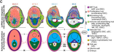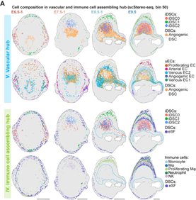 作者使用华大基因组开发的Stereo-seq技术,对小鼠妊娠早期E6.5-E9.5着床位点进行空间转录组测序。结合单细胞转录组和空间转录组测序结果,本文首次鉴定出着床位点的主要由蜕膜组织细胞、免疫细胞、血管内皮细胞和滋养层细胞等所组成的8个功能中心 (functional hub, hub I-VIII)。其中,功能中心I至III主要由蜕膜基质细胞构成,是蜕膜化过程的主要发生区域;功能中心IV(免疫招募中心)富含免疫细胞;而功能中心V(血管生成中心)则富集血管内皮细胞和血管生成相关的蜕膜细胞亚群 (图2)。功能中心的细胞比例和空间位置分布随时间的动态变化代表妊娠过程中关键生物学事件的发生。
