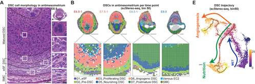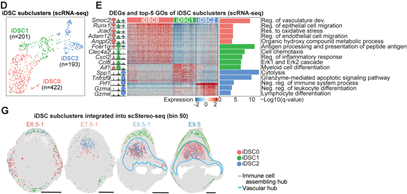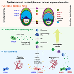 研究者在对细胞进行亚群分析过程中,发现一群特殊的蜕膜基质细胞亚群,整体转录组与血管生成相关的DSC亚群相似。基因富集分析发现,该群细胞高表达免疫活动相关基因(如Cxcl2, Ccl6, Gzma/e, Tnfrsf9和Spp1等),通路富集分析显示具有“白细胞增殖”和“抗原呈递”的功能。因此,将其命名为iDSC(immune-featured DSC)。随后,进一步基于转录组差异分为3个亚群: iDSC0/1/2,结合空间转录组数据Stereo-seq, 免疫荧光染色和ISS(in situ sequence)结果显示该三个亚群随着妊娠过程呈现不同的空间定位,并最终在E8.5之后分布于免疫招募和血管生成中心。其中iDSC0高表达与血管发育相关的基因(如: Angpt2, Runx1, Jcad 和 Adam12);iDSC1亚群高表达炎症反应相关基因(如: Clec4a2, Cxcl2, Ccl6 和Aif1);iDSC2高表达细胞溶解和凋亡相关的基因(如: Prf1, Gzma/e, Tnfrsf9 和Spp1)。空间定位上,iDSC0和iDSC2主要位于血管生成中心,iDSC1位于免疫招募中心(图4)。综合iDSC亚群分子特征和空间定位,由此推测,iDSC三个亚群分别在免疫反应和血管生成等生物学活动中扮演重要角色。