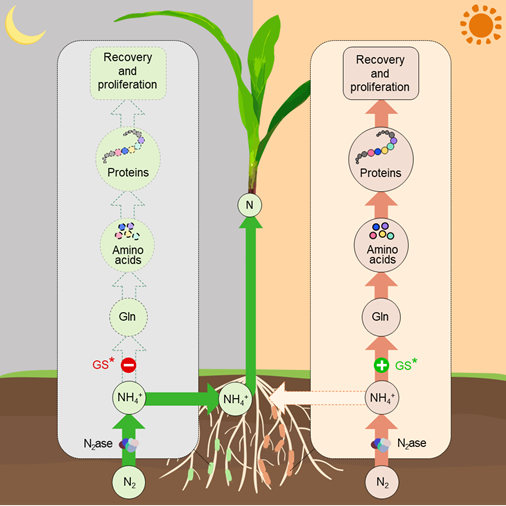 定殖在植物根际的联合固氮菌通过吸收植物根际分泌物进行生物固氮,通过其温度依赖型谷氨酰胺合成酶介导联合固氮菌双重生活方式的转换。在夜间(23°C条件下),其所固定的氮素与氨同化处于解偶联状态,联合固氮菌通过牺牲自身生长进行生物固氮与泌铵,并将泌出的氮素输送给谷物;在白天(30°C条件下),其所固定的氮素与氨同化处于偶联状态,所固定的氮素为联合固氮菌的生长恢复和细胞增殖提供营养。GS*表示P95L突变的GS。N2ase表示固氮酶。