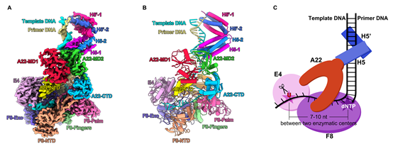 图1,猴痘病毒DNA聚合酶F8-A22-E4-H5四元复合物冷冻电镜结构(A-B)及模式图(C)。