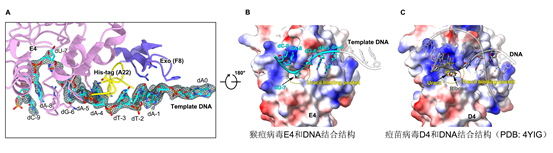 原核生物和真核生物经典的DNA聚合酶中的复制持续性因子PCNA结合在聚合酶活性中心下游的dsDNA区域(图3A),环绕dsDNA防止DNA底物的脱落。在猴痘病毒聚合酶四元复合物结构中,已知的复制持续因子A22-E4结合在活性中心上游的模板ssDNA区域(图1C),在分子机制上与PCNA完全不同。该工作的结构分析认为,A22-E4可能一方面通过E4与ssDNA的结合特性促进聚合酶与DNA底物的结合,另一方面A22、E4以及F8的部分结构域共同组成了一个封闭的环,环绕ssDNA区域防止DNA底物的脱落,从而增加聚合酶的复制可持续性(图1C)。