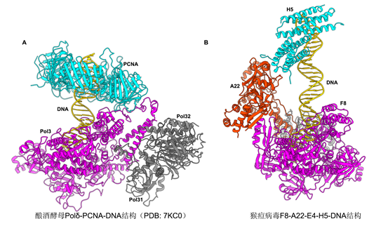 自2022年5月疫情爆发以来,猴痘在世界范围内广泛传播,威胁人类健康。今年6月份以来,我国猴痘病例骤增,国家卫健委已将猴痘纳入乙类传染病管理。引发此次疫情的猴痘病毒(monkeypox virus, MPXV)属于痘病毒科(Poxviridae family)正痘病毒属(Orthopoxvirus genus),是一种大型、有包膜、双链DNA病毒。该家族还有两个熟知的成员,痘苗病毒(vaccinia virus)和天花病毒(variola virus)。DNA复制机器尤其是DNA聚合酶是抗正痘病毒药物的重要靶标,该复合物高分辨率结构的解析能够为抗猴痘药物和疫苗的开发提供关键的结构基础。