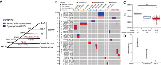 图1. 猴痘病毒OPG027在不同分支的演化、连锁的氨基酸变异以及密码子使用和致死率的变化趋势
