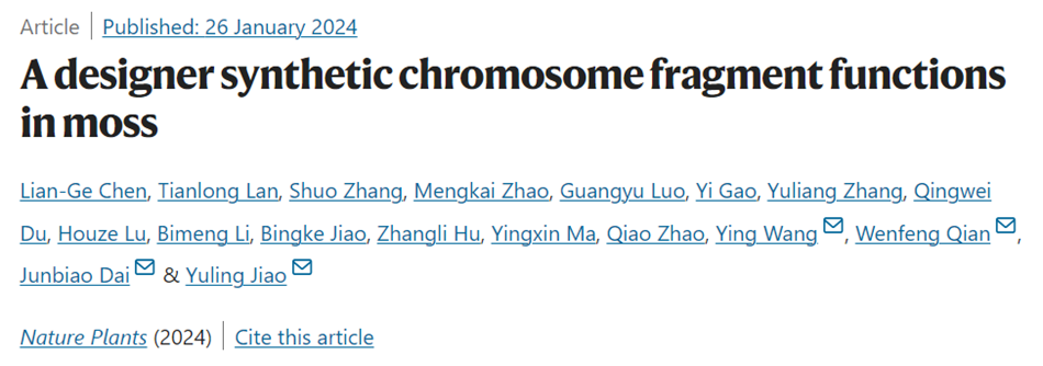 2024年1月26日,PA视讯游戏平台官网焦雨铃课题组和中国农科院深圳农业基因组所戴俊彪课题组、中科院遗传发育所钱文峰课题组、中国科学院大学汪颖课题组等合作在Nature Plants在线发表了题为A designer synthetic chromosome fragment functions in moss的论文。该研究重新设计了染色体序列,极度简化了基因组,对内源序列进行了大幅删减(55.8%),并加入了人工标签。该研究进一步合成并组装了设计序列,并在小立碗藓体内完成了约1/3染色体臂的替换。所获合成株系能够正常生长,合成区域的表观遗传景观也能够正常重新建立。