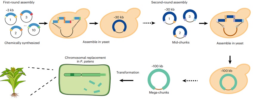图2. 小立碗藓基因组大片段合成、组装和替换重组流程示意图