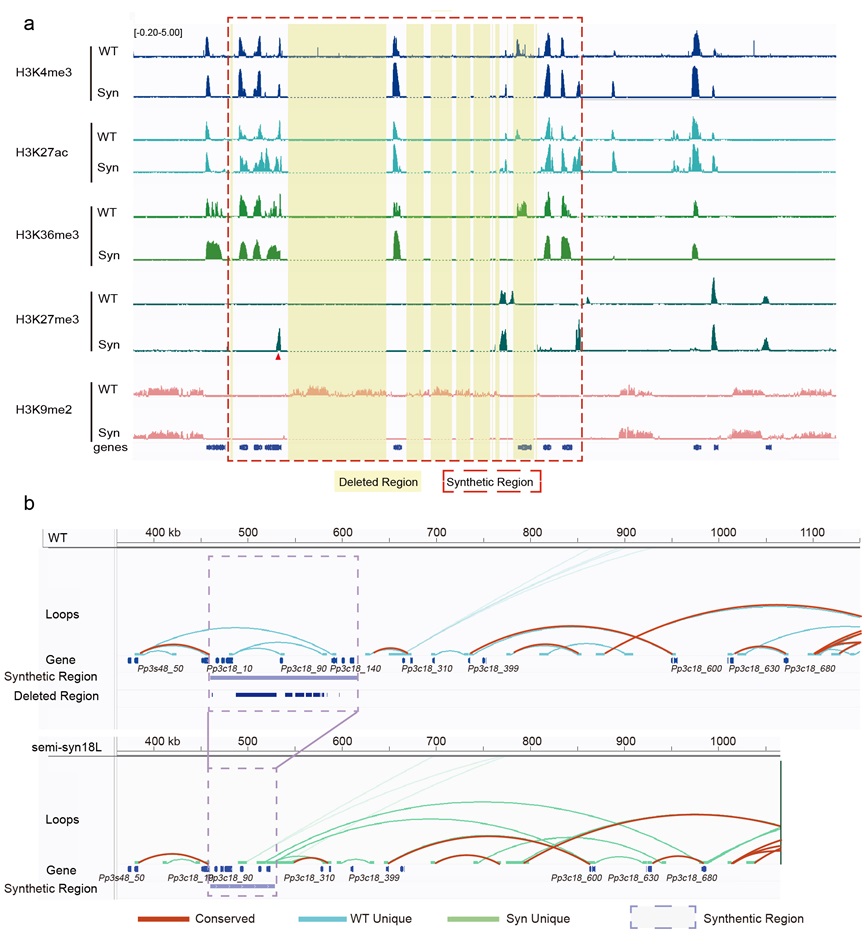 图3. (a)半合成型小立碗藓(semi-syn 18L)在合成区域中组蛋白修饰与野生型的对比。(b)半合成型小立碗藓(semi-syn 18L)在合成区域及周边区域染色质环分布与野生型对比。