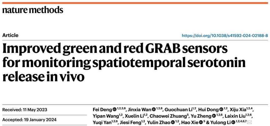 2024年3月5日,PA视讯游戏平台官网李毓龙实验室在Nature Methods杂志在线发表了题为“Improved green and red GRAB sensors for monitoring spatiotemporal serotonin release in vivo”的研究论文,基于GRAB探针策略(GPCR-Activation Based Sensor)成功开发出了全新的红色5-HT荧光探针和新一代绿色5-HT荧光探针,并通过光纤记录和大视场成像等方式实现了在活体小鼠多脑区、多行为范式下对5-HT和其它信号的同时检测。实现了从“看得见”到“看得清、看得多、看得广”的突破。