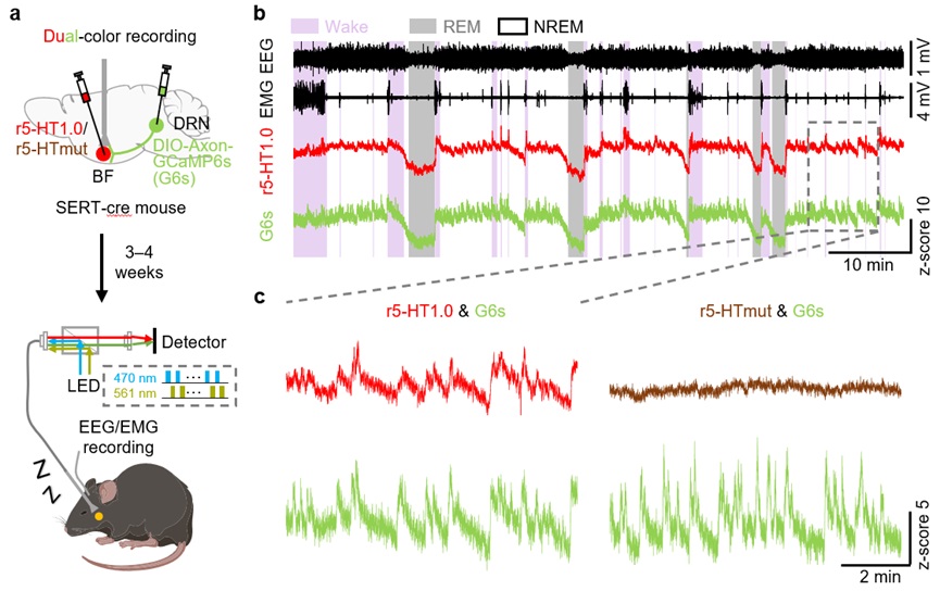 图2. 光纤双色记录基底前脑的5-HT和5-HT能神经元轴突钙信号
