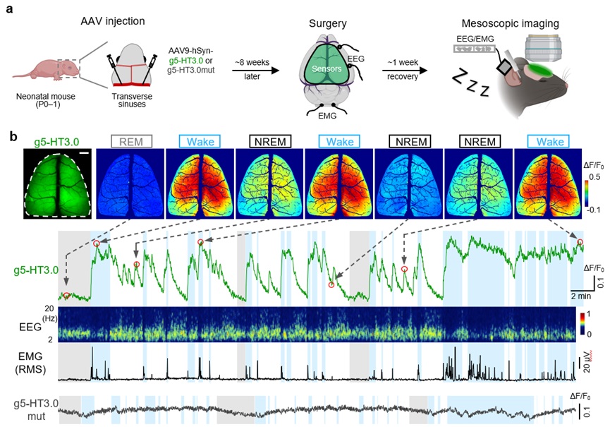 图3. 睡眠觉醒周期小鼠背侧皮层5-HT的时空动态