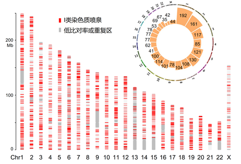 图1. Fun算法鉴定到的染色质喷泉位点在基因组上的分布情况。