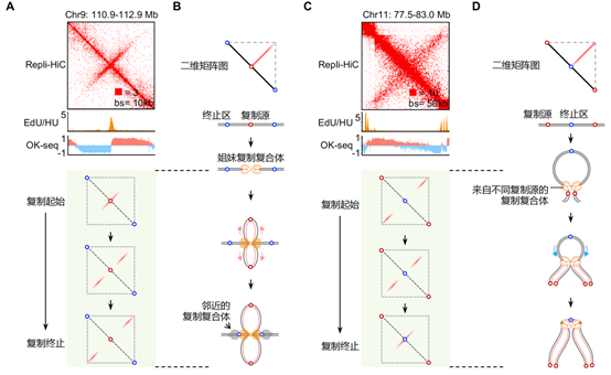 A-D.偶联的姐妹复制叉(A和B)和相向行进复制叉(C和D)分别形成第一类和第二类染色质喷泉结构。在A和C中,EdU/HU鉴定早期复制起始;OK-seq鉴定复制起始(由负到正)和终止(由正到负)。浅绿色背景中展示了Repli-HiC分析复制起始、延伸和终止阶段的二维矩阵示意图。