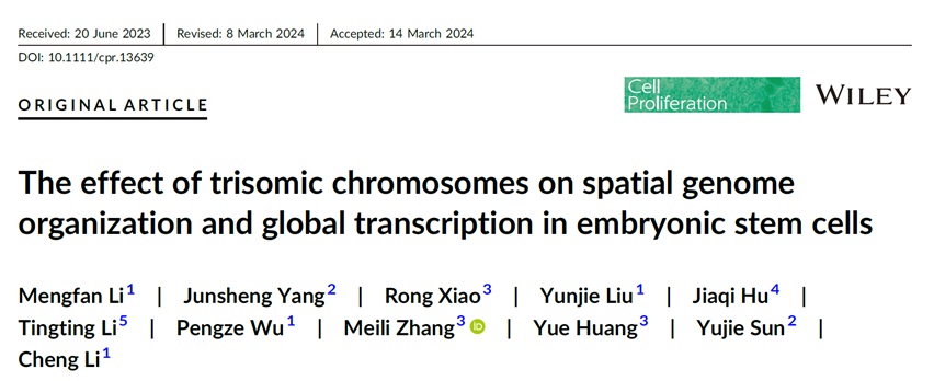 2. Li M, Yang J, Xiao R, et al. The effect of trisomic chromosomes on spatial genome organization and global transcription in embryonic stem cells. Cell Prolif. Published online March 29, 2024. doi:10.1111/cpr.13639