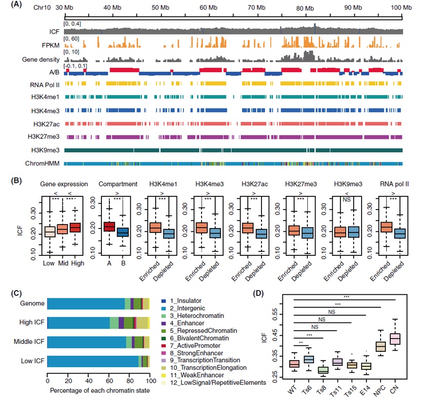 通过计算每个基因组区域的染色体间相互作用比例(ICF),研究者发现ICF较高的染色体区域往往具有较高的基因密度和活跃的转录状态,并且较多位于A区室。此外,ICF值的分布在WT和异倍体组中有所不同(图1),但总体上低于小鼠神经祖细胞(NPC)和皮质神经元(CN),这与分化细胞具有较高的染色体间混合程度(chromosomal intermingling)的结论相一致【4】。这些结果表明染色体间相互作用与转录活性有关,并且是细胞类型特异性的。