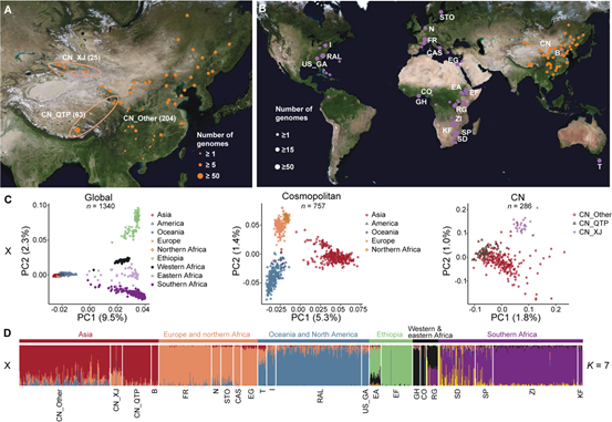(A)中国292个黑腹果蝇品系的地理位置;(B)全球1356个果蝇基因组的地理来源;(C)基于X染色体中性位点的主成分分析结果;(D)基于X染色体中性位点的ADMIXTURE结果。