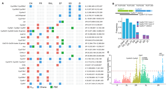 (A)各主要群体中杀虫剂相关的自然选择信号;(B)Cyp6a17和Cyp6a23区域结构变异在各群体中的等位基因频率;(C)群体箱实验中高效氯氟氰菊酯抗性相关位点在基因组上50 kb滑动窗口中的富集情况。