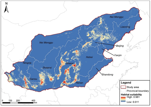图1. 基于集成物种分布模型预测的华北中部地区豹的栖息地适宜度