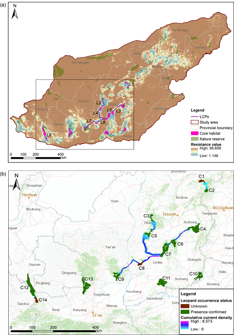 图2. 豹核心栖息地斑块之间的连通性(a)和主要的潜在扩散廊道(b)