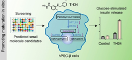 而后,研究团队通过靶向单细胞多组学分析中找到的参与胰岛β细胞功能成熟的调控因子,预测了一个化学小分子库,通过体外的功能筛选发现HDAC抑制剂TH34能够显著改善体外分化获得的胰岛β细胞的功能成熟性,这些改善包括葡萄糖响应性的胰岛素分泌水平、成熟胰岛素颗粒的数量、线粒体氧化呼吸能力等。更为重要的是,TH34处理后的人多能干细胞衍生胰岛细胞移植能够在更短的时间内逆转小鼠糖尿病。进一步的机理解析显示,TH34主要通过调节神经酰胺代谢稳态促进胰岛β细胞功能成熟。