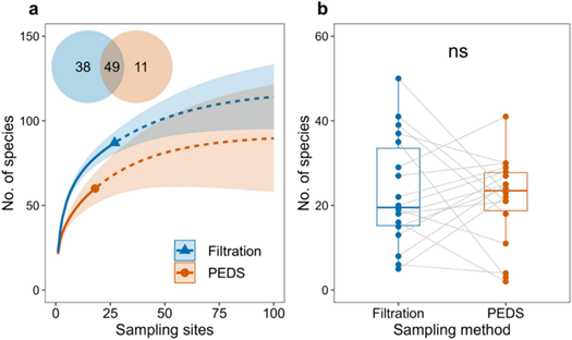 为了科学保护淡水和海洋生态系统,准确高效地评估水生生物多样性及其变化趋势至关重要。eDNA技术利用环境中脱落的DNA(例如,水、土壤、空气)而非直接捕获生物体,实现高效且非侵入性地生物群落调查。尽管eDNA技术提高了生物监测的效率和准确性,但常规的主动过滤的eDNA采集方法仍面临诸多挑战,包括劳动强度大、耗时长、滤膜易堵塞、交叉污染风险高,以及对过滤设备和电源的依赖等。本课题组研发的基于玻璃纤维滤膜的PEDS通过被动吸附收集水中的eDNA,避免了诸多主动过滤法的缺陷,提供了一种更简便、高效、经济的替代方案。然而,对于生物多样性丰富且环境复杂的自然水体,该eDNA采样方法的有效性尚未得到充分验证。