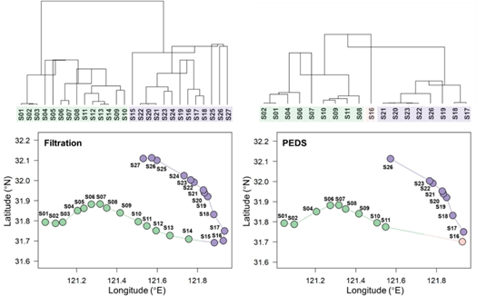 图3. 基于空间约束的群落层次聚类分析。结果显示两种eDNA采样方法检测鱼类群落沿江(海)岸的空间变异模式相同。