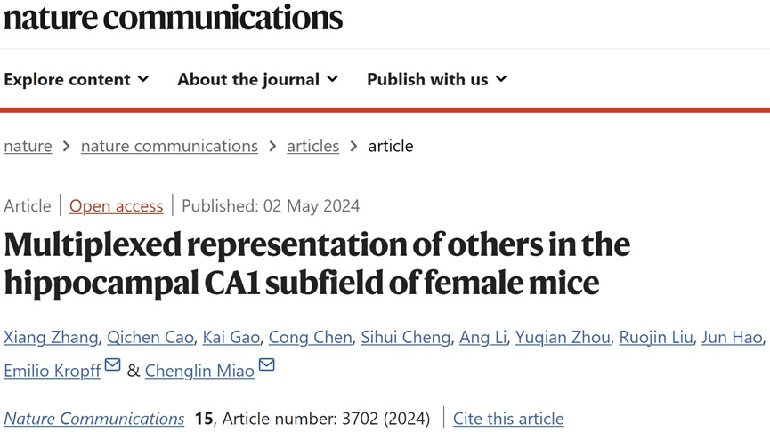 5. Zhang, X., Cao, Q., Gao, K. et al. Multiplexed representation of others in the hippocampal CA1 subfield of female mice. Nat. Commun. 15, 3702 (2024).
