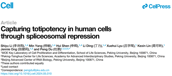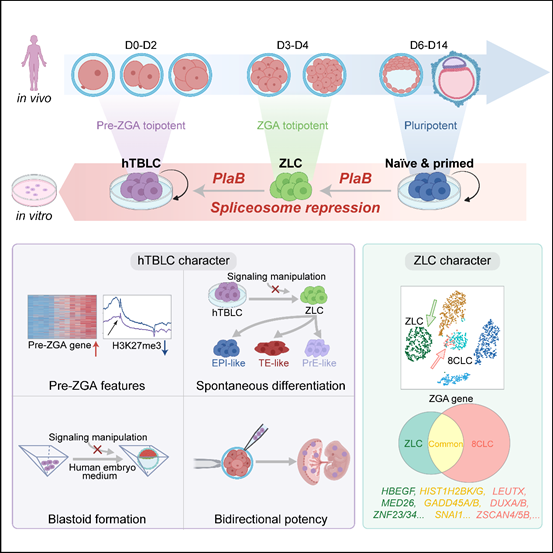 2024年6月5日,PA视讯游戏平台官网杜鹏课题组在Cell杂志在线发表了题为 Capturing Totipotency in Human Cells Through Spliceosome Repression 的研究论文。在这项研究中,作者通过抑制剪接体重编程人多能性干细胞,成功捕获了两种人全能性状态的细胞。第一种细胞是区别于8CLC的独特ZGA-like细胞ZLCs(ZGA-like cells),该细胞随后可以转变成为具有pre-ZGA特征的hTBLCs(human totipotent blastomere-like cells),并且能够在体外稳定培养。