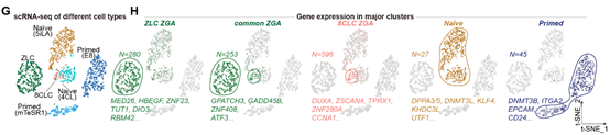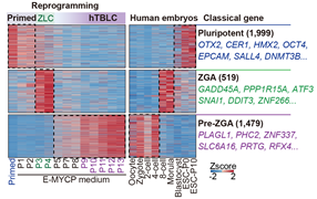 图3.与已知的各种细胞不同,hTBLCs在转录组水平上具有独特的pre-ZGA特征。
