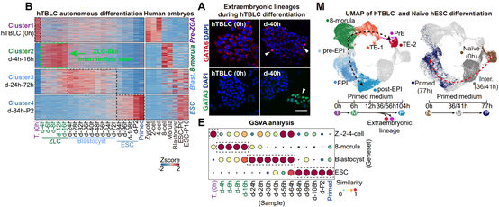 3.基于hTBLCs的自发分化体系能够模拟人着床前胚胎发育