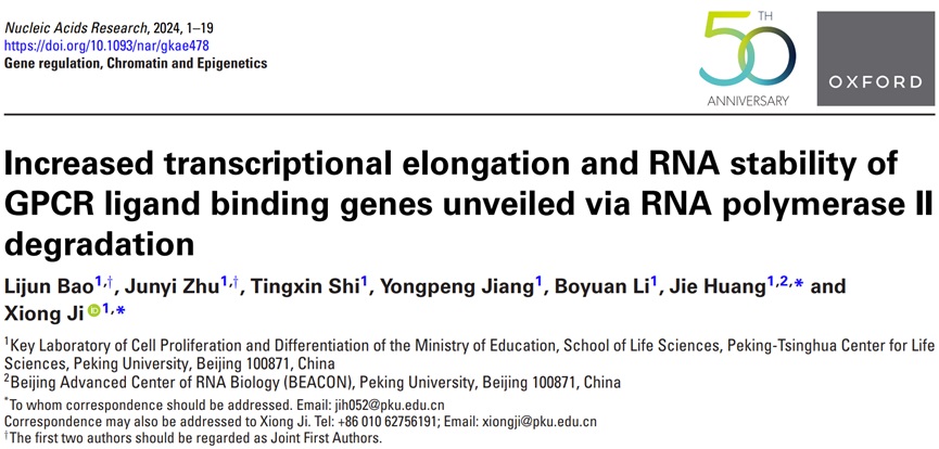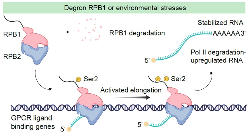 2024年6月6日 ,PA视讯游戏平台官网、北大-清华生命科学联合中心季雄课题组在Nucleic Acids Research发表了题为“Increased transcriptional elongation and RNA stability of GPCR ligand binding genes unveiled via RNA polymerase II degradation”的研究论文。本研究的结果显示Pol II的大亚基RPB1蛋白降解会导致全局性的基因表达下调,但与G蛋白偶联受体(GPCR)配体结合相关的一小部分基因却会上调表达,原因是这些基因的转录延伸和mRNA稳定性增加。在外部环境刺激引起Pol II的大亚基降解后,这一现象同样被观察到,表明细胞通过提高GPCR配体结合相关基因的转录延伸和RNA稳定性来应对细胞中转录全局下调引发的反馈机制。