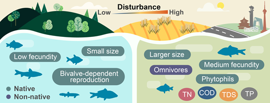 此外,本地和非本地鱼类基于相对序列丰度的物种分类和功能β多样性随城市化压力的增加呈现出了差异响应模式。本地鱼类β多样性由β替换组分(replacement)主导,且整体的β多样性和β替换组分随干扰水平增加而显著降低;非本地鱼类β多样性由β丰富度(richness)主导,且β丰富度随干扰程度增加而增加。研究结果提示本地鱼种群落结构差异主要由环境或生态因素决定,而非本地鱼种的群落结构差异主要由物种或性状丰富度的得失造成。