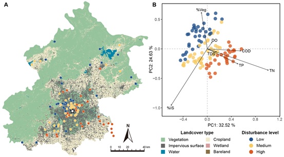 全球城市化进程的加速使得生物多样性面临着丧失和群落结构重塑的严重威胁。理解城市化对生物多样性的影响对于制定保护策略至关重要,但目前对城市化在精细尺度上对鱼类群落功能结构的影响了解甚少。传统鱼类调查主要依靠捕捞等方法,难以在城市环境大规模开展。本研究以全球城市化范例北京为研究区域,采集了全面覆盖了北京城区、近郊和远郊的109个水体的样品,开展了基于环境DNA(eDNA)方法的鱼类多样性调查(图1)。利用无损伤性、高效率、高灵敏且高精准度的eDNA宏条形码方法,通过扩增鱼类DNA及高通量测序,共鉴定到75种鱼类,包括52个本地原生鱼种和23个非本地鱼种。同时对各采样水体的水质理化指标和周边地表覆盖类型比例进行了测定和计算,并基于PCA分析结果将采样点划分为低、中、高三个干扰水平,低干扰水平的水体通常具有较高的植被覆盖率和溶解氧浓度,而高干扰水平的水体则与较高的水质污染指标和建筑用地等不透水地面比例相关(图1)。