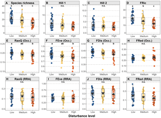 图2 鱼类物种和功能α多样性在不同干扰水平下的差异比较