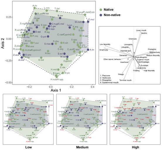 对北京地区鱼类功能性状的PCA分析表明,本地和非本地鱼类功能空间存在较大的重叠,非本地鱼类功能空间随干扰程度增加出现明显缩减,而本地鱼种整体的功能空间变化不大(图3)。外来鱼种的入侵并没有增加和补偿本地鱼类的功能多样性,随城市干扰强度增加而消失的本地稀有物种应成为城市生物多样性保护的重点。