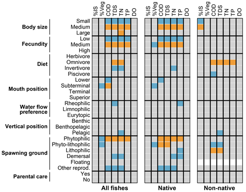 图4 鱼类功能性状对环境变量的响应关系(橙色/蓝色分别表示正/负相关)