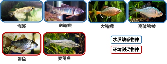 RLQ和四角分析结果提示鱼类体型大小、繁殖力、食性和繁殖偏好与水质显著相关,较大体型、较高繁殖力和偏好利用植物进行产卵繁殖的本地鱼类以及杂食性的非本地鱼类是城市环境中的赢家;而较小体型、较低繁殖力和依赖于双壳类进行产卵的本地鱼类对水质污染较为敏感,是城市水体中的输家(图4)。特别是青鳉、宽鳍鱲、高体鳑鲏、大鳍鱊等鱼种,由于其对水质指标的高度敏感性,可以作为水环境指示物种(图5)。
