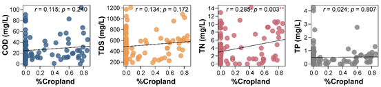 此外,研究也分析了水质指标与不同土地利用类型的关系。结果显示与水体营养物水平最为高度相关的并非通常视为城市化程度指标的不透水表面,而是农田的比例(图6)。这提示对城市水体质量的保护必须重视农业活动的影响,加强对施肥等水体污染源的管理。