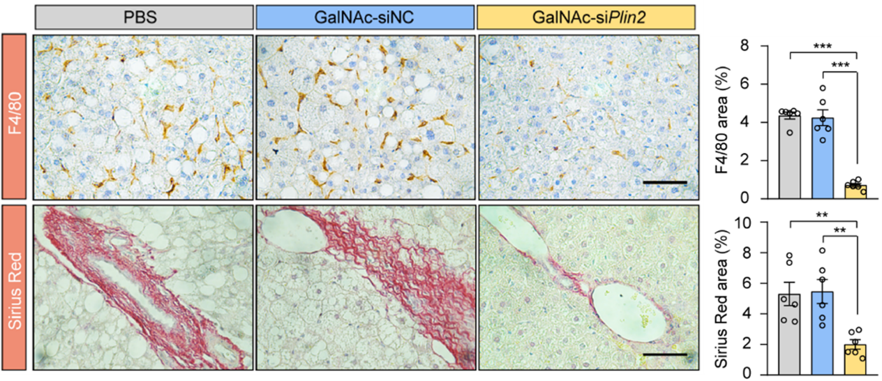 为了探究该疗法对MASLD炎症和纤维化进程的影响,研究者采用高脂高果糖饮食诱导的小鼠模型,并检验了该siRNA药物的治疗效果。数据显示,在野生型小鼠和人源化PLIN2敲入小鼠中,该核酸药物均能有效缓解脂肪变性、炎症和纤维化等多项指标,进一步证实了其作为MASLD治疗药物的潜力(图3)。